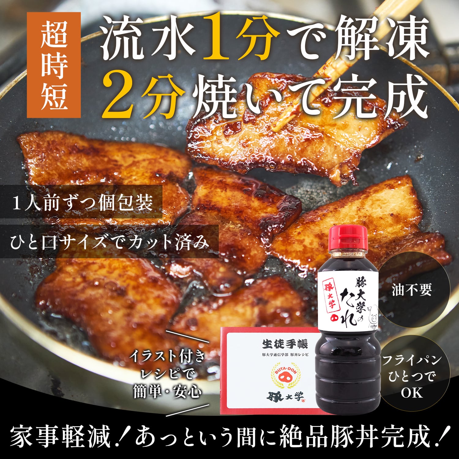 厳選した豚バラ肉を秘伝のタレに付けこみ急速冷凍致しました。これによりご自宅での調理でも豚大学の味を存分にお楽しみ頂けます。