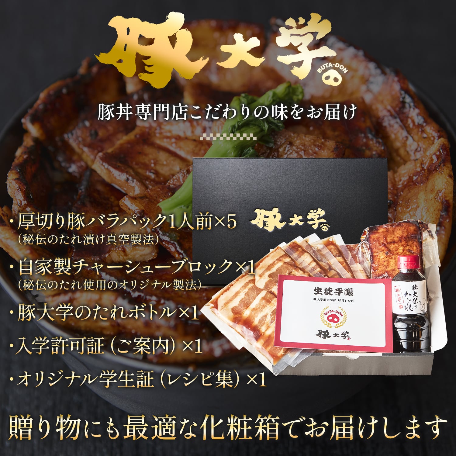 豚大学の豚丼をご自宅でお楽しみ頂ける様仕上げました。